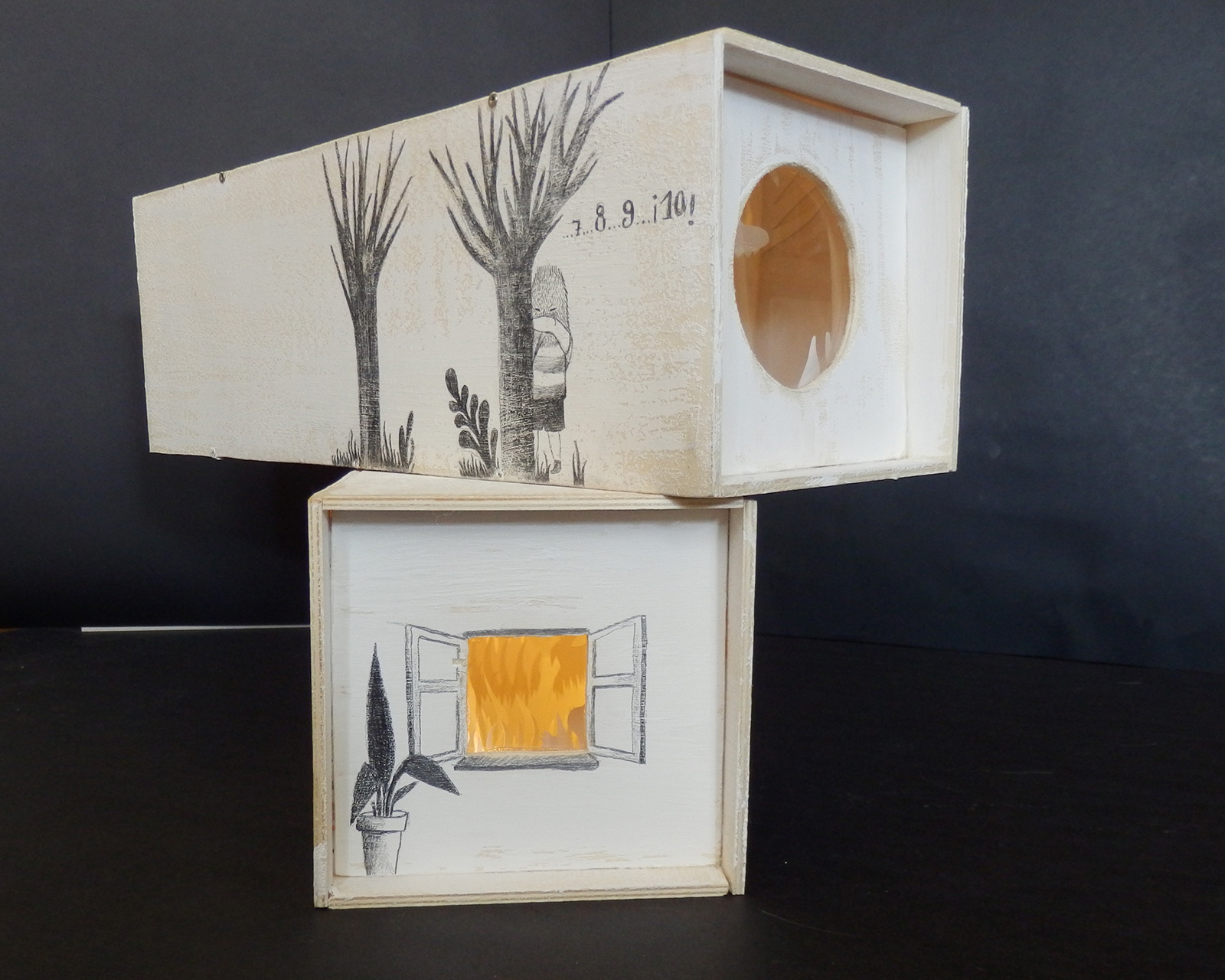 Cajas realizadas en contrachapado calabó de 5 mm. Dibujadas a lápiz y barnizadas. Interior realizado con capas de papel cortado a mano.
