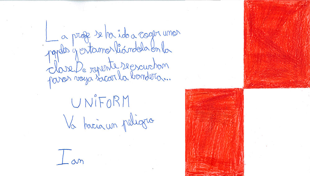 «La profe se ha ido a coger unos papeles y estamos liándola en la clase. De repente se escuchan pasos, voy a sacar la bandera… UNIFORM» Ian.